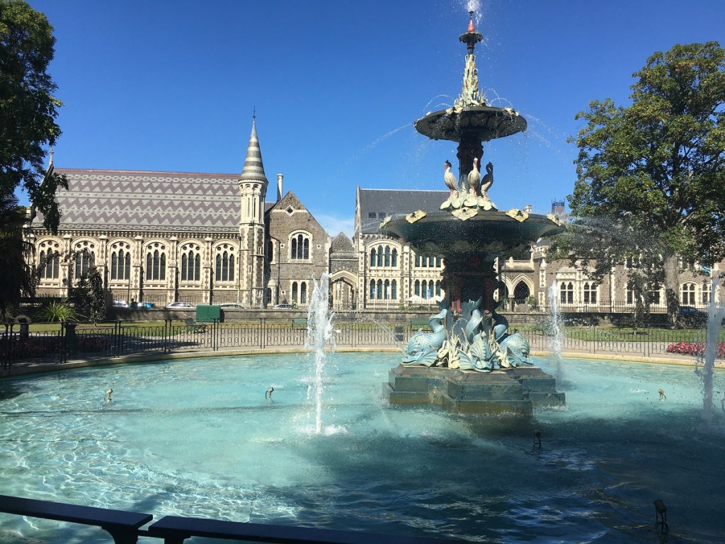 As we progress to the Botanical Garden, we see the Peacock Fountain with the Arts Centre Te Matatiki Toi Ora behind.