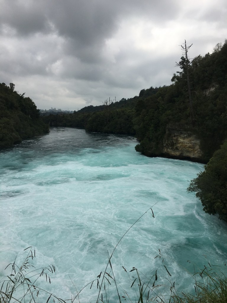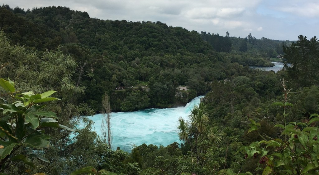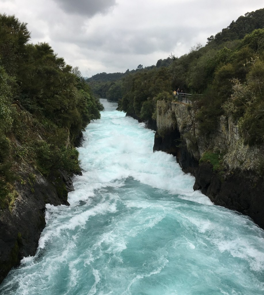 Huka Falls is the most visited natural attraction in New Zealand. It is only a few minutes drive from the charming town of Taupo at the outlet of Lake Taupo. Huka Falls is on the Waikato River, the longest river in New Zealand. Since it drains New Zealand’s largest lake and is so near the outlet, it’s water is a stunningly beautiful blue.