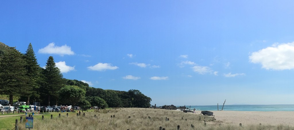 This shows the beach with our lime green Jucy van on the left in it’s seaside campsite.