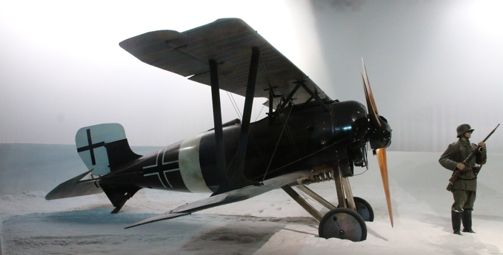 The Pfalz D.III was in use from Aug 1917 to Nov 1918. While one of the prettier aircraft of the era, it was a poor performer in many areas, except that it’s laminated plywood fuselage outperformed other aircraft in steep dives. This is a replica built for the 1960’s movie “The Blue Max”. It’s colour scheme originated from the movie, not the war.