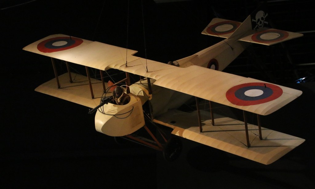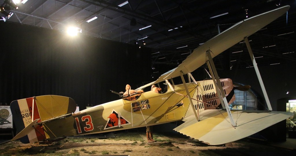 The Spad A2, shown here as a model, was developed before guns were synchronized with propeller. It moved the propeller, engine and pilot back placed a gunner compartment in front of the propeller. The British built a single aircraft and never deployed it. The French built 100 of them, 50 going in service in France and 50 in Russia, whose colours are shown here.