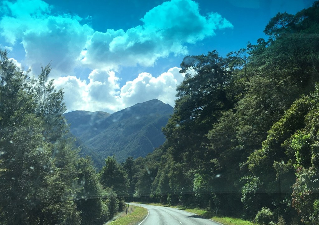 The route leaving Haast goes over Haast Summit into Otago, the central province of the south Island. When you pass the summit you exit the coastal rain forest and enter a dry interior zone reminiscent of the Okanagan Valleys in British Columbia and Washington State. But for the moment today’s ride begins in the lush vegetation of the west coast rain forest. This first stretch of road had many trees hanging out over the highway.