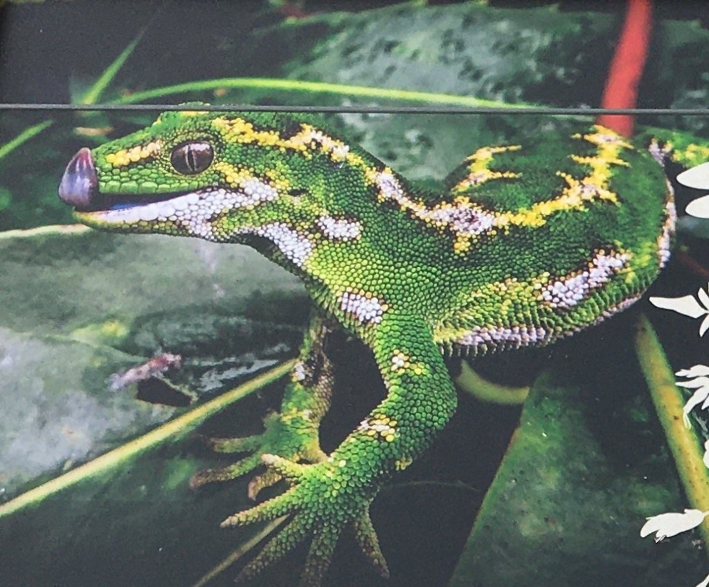 This is a jewelled gecko, one of the most distinct of New Zealand’s nine species of green geckos. It occurs only on the South Island and there only within Otago and Canterbury.