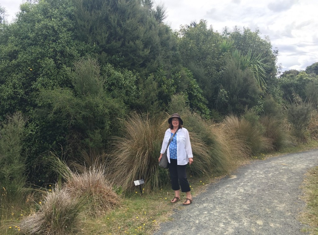 Here Lynne is with Red Tussock grass. These are long lived plants that seed profusely at irregular intervals. Southern Māori used tussock fibres to make leggings to protect their legs from speargrass.