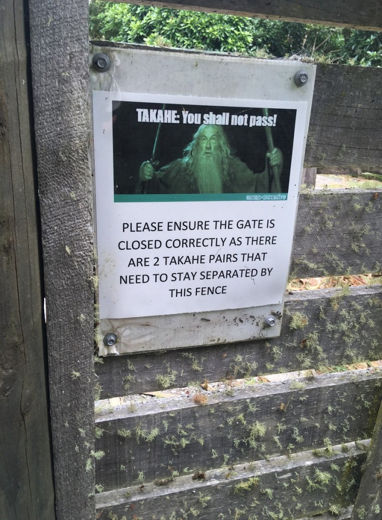 In this section on birds, what is not seen is as important as what is seen. This sign warns you to ensure that this gate remains closed so that no takahē can pass through. This is important since takahē are fiercely territorial and need a lot of space. Territories ranging between 4–100 ha, depending on the availability and quality of their food. In confined spaces separating them helps avoid injuries that might occur in territorial conflicts.