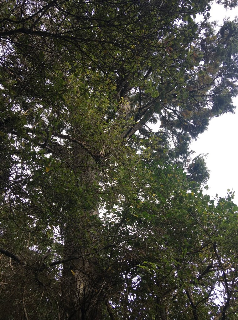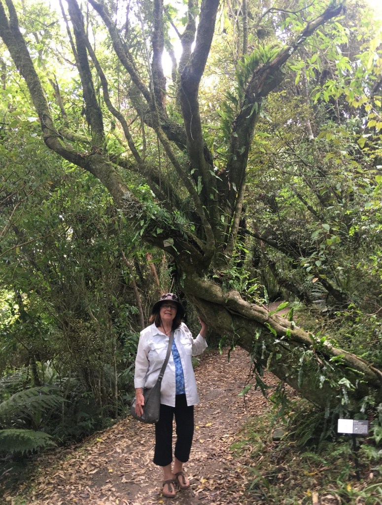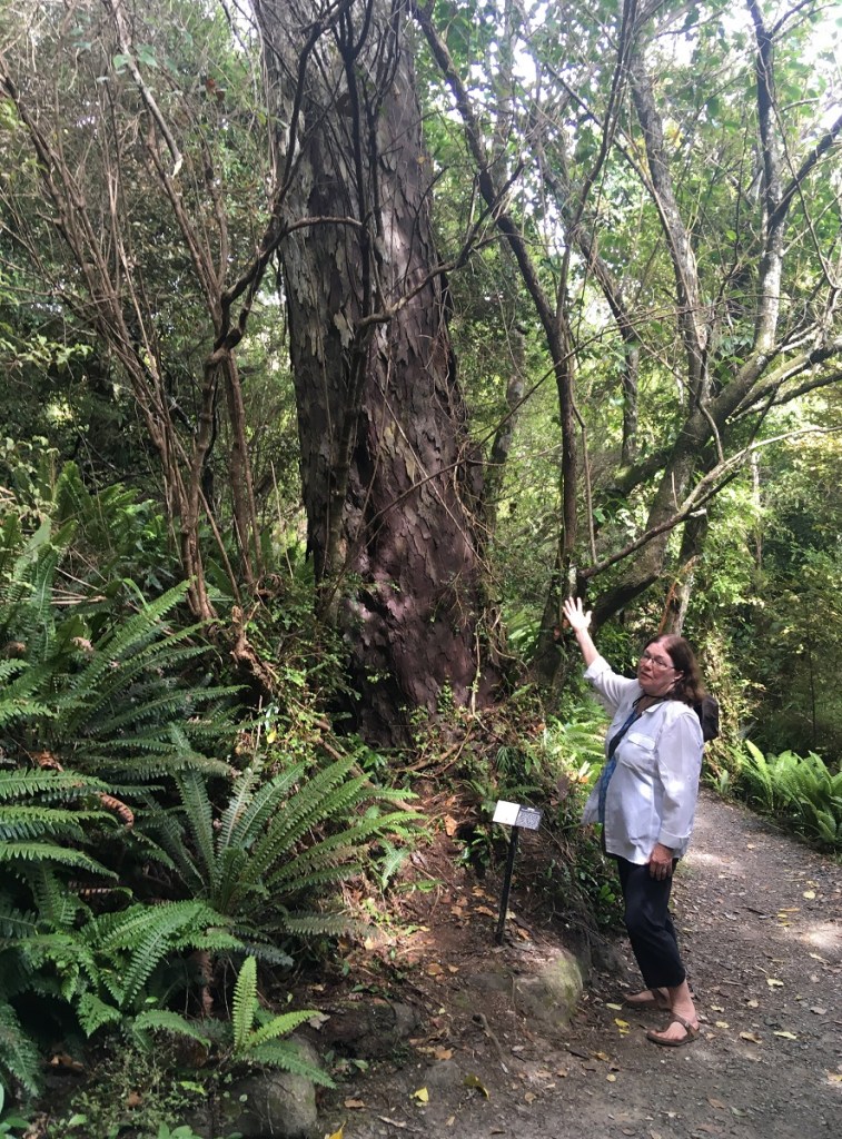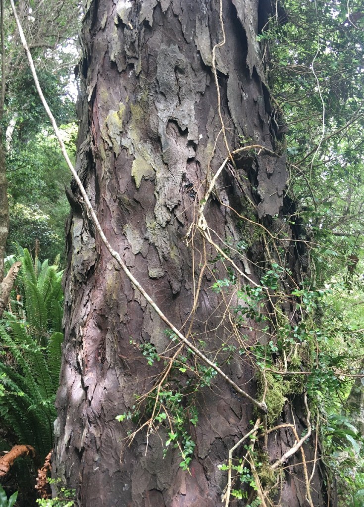 Here Lynne is with a tree called a rimu. The following two photos show the upper trunk of the tree and it’s bark.