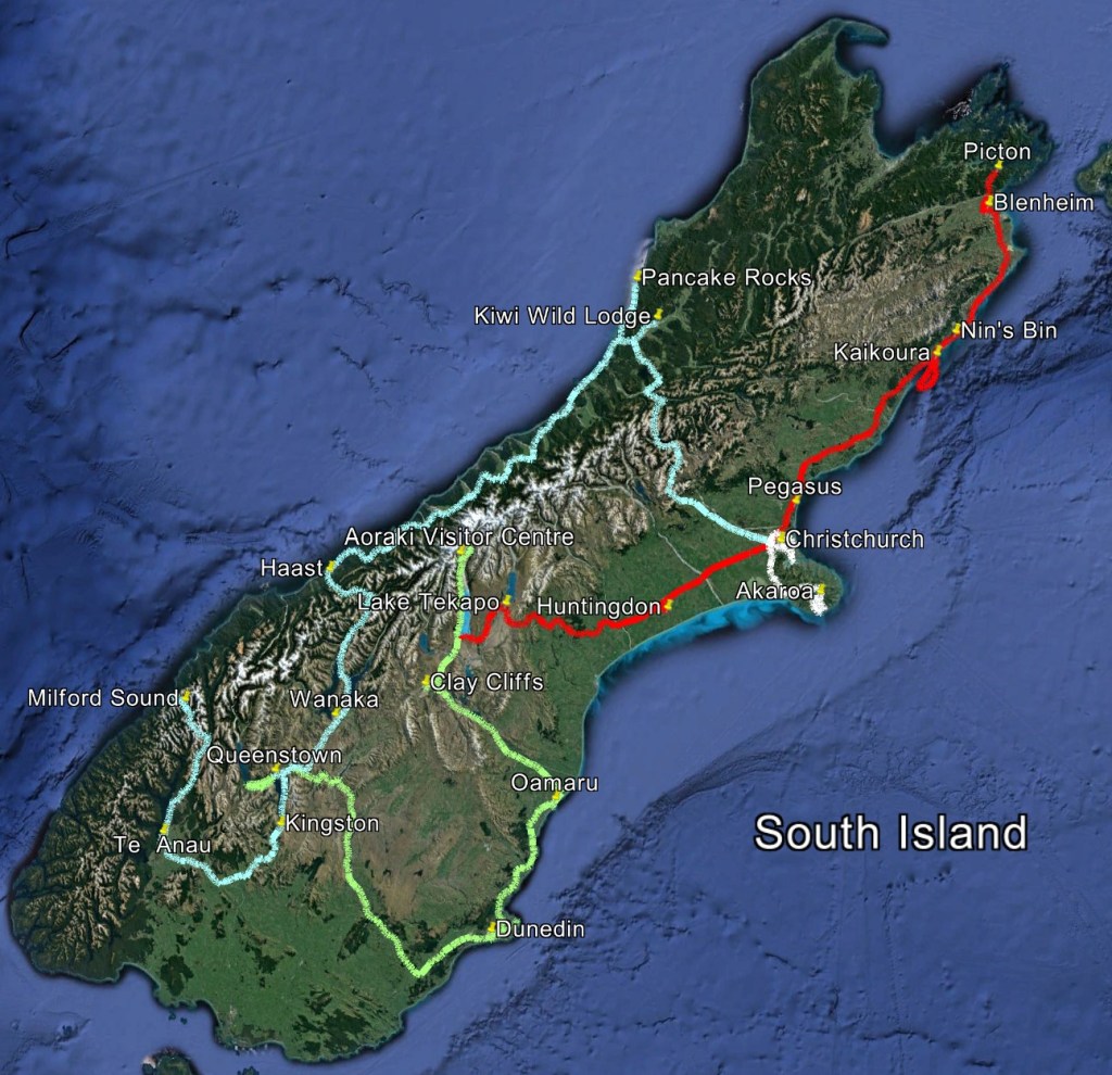 Beginning in the Christchurch area, we spent February on the South Island. The following image traces our route by week. Week 1 is in white, week 2 in turquoise, week 3 in green and week 4 in red.
