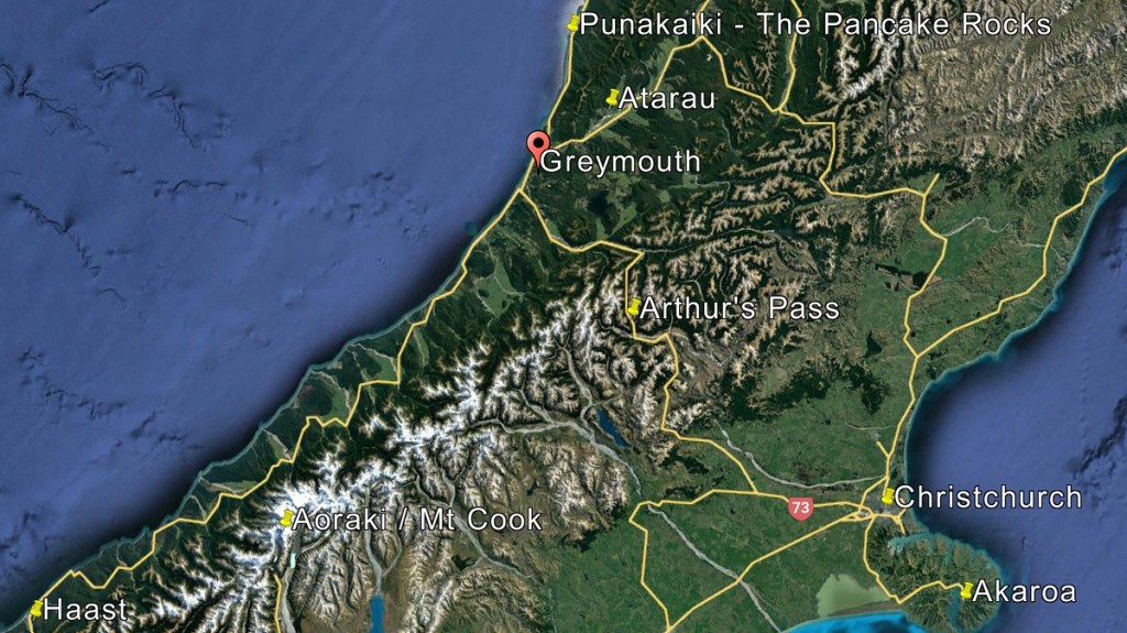 We departed Akaroa for Atarau near Greymouth on the West Coast. Exiting Atarau involves a windy mountainous road before you reach the Canterbury Plains and Christchurch en route to Arthur’s Pass and the coast. Our van’s brakes began to howl as we drove this route and we spent the afternoon receiving begrudging and not very timely service at Jucy in Christchurch. Consequently, we crossed Arthur’s Pass in the dark, unfortunate as it is a scenic national park.